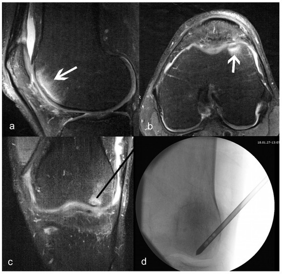 (a) Sagittal and (b) axial T2-weighted images of bone marrow lesion (shown with arrows) of the medial condyle; (c) planned position of the delivery canula placement (black line); (d) actual fluoroscopy indicating correct placement of the delivery canula.
