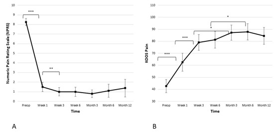 Significant reduction in pain is observed in both the (A) Numeric Pain Rating Scale (NPRS) and the (B) Knee Injury and Osteoarthritis Outcome Score (KOOS) pain subscale. The reduction is the most significant within the first 6 weeks when it reaches plateau and stays stable during the observed period of 12 months (* p < 0.05, ** p < 0.01, *** p < 0.001).