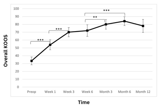 Overall Knee Injury and Osteoarthritis Outcome Score (KOOS) significantly improved. The improvement is linear during the first 3 weeks, and the improvement continues until the 6-month time point, when a slight reduction is observed. However, the score remains high at the 12-month time point (** p < 0.01, *** p < 0.001).
