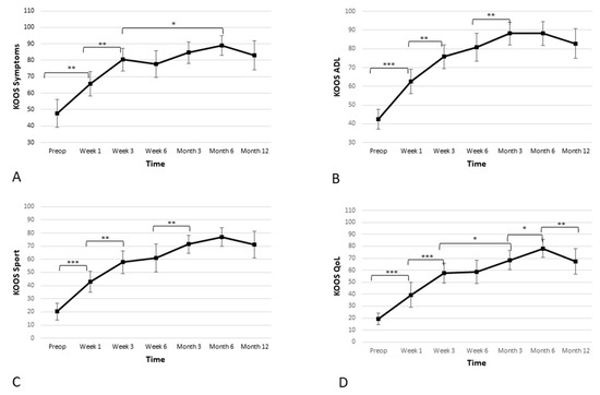 Significant improvement in the four additional subscales—(A) symptoms, (B) activities of daily living (ADL), (C) sport, and (D) quality of life (QoL)—of the Knee Injury and Osteoarthritis Outcome Score (KOOS) is observed. The improvement is linear during first 3 weeks, and the improvement continues until the 6-month time point, when a slight reduction is observed. However, the score remains high at the 12-month time point (* p < 0.05, ** p < 0.01, *** p < 0.001).