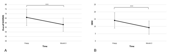 In the overall WORMS scale, the average score at admission was 66.1 ± 19.4, and the subscore for SBM abnormality was 14.2 ± 11.4. As seen in Figure 5 at the 3-month time point, there was a statistically significant improvement in the overall score and SBM subscore (58.0 ± 15.9 p < 0.001 and 9.3 ± 9.7 p < 0.001).