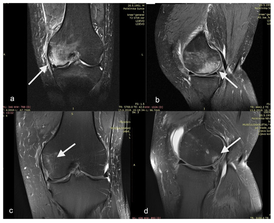 T2−weighted magnetic resonance imaging of patient’s left knee as (a) AP view and (b) LL view before surgery showing medial femoral condyle bone marrow lesion. The same patient in (c) AP view and (d) LL view at 12−month follow−up. Bone marrow lesions are show with arrows.