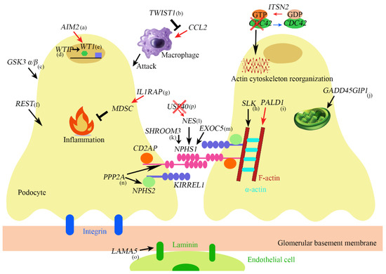 (a) AIM2 promotes podocyte differentiation and suppresses proliferation by increasing WT1 and cell cycle genes such as CDKN1A. (b) TWIST1 inhibits CCL2 induction which promotes monocyte/macrophage infiltration into the injured glomeruli. (c) GSK α/β knockout causes mitotic catastrophe. (d) If WTIP is retained in the nucleus, WTIP associates with WT1 and inhibits WT1-dependent transcriptional activation of the amphiregulin promoter. (e) WT1 is both a transcriptional repressor and activator and regulates genes important in nephron formation including podocalyxin, amphiregulin, and perhaps nephrin. (f) REST maintains cytoskeleton homeostasis protects against apoptosis and maintains kidney function during aging. (g) IL1RAP induces suppressive immune cells called myeloid-derived suppressor cells (MDSCs). (h) SLK is a regulator of cytoskeletal structure. (i) PALD1 regulates actin filaments, synaptopodin, and α-actinin-4. (j) GADD45GIP1 plays an essential role in mitochondrial synthesis and membrane integration of OXPHOS polypeptides. (k) SHROOM3 is related to Fyn activation and nephrin phosphorylation. (l) NES regulates nephrin. (m) EXOC5 affects the expression and localization of nephrin. (n) PP2A is involved in the expression of synaptopodin, podocin, nephrin. (o) LAMA5 encodes Laminin-α5. (p) USP40 is colocalized with NES in developing and mature podocytes. Its deficiency upregulates NES.