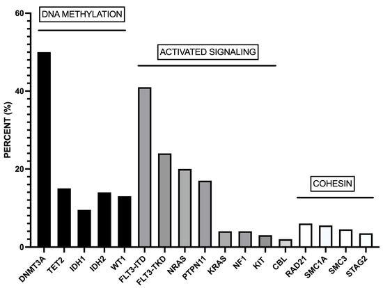 Most recurrent co-mutations observed in adult AML patients. These co-mutations involve genes pertaining to DNA methylation, activated signaling, and the cohesin complex. The data were obtained from Ivey et al. [15].