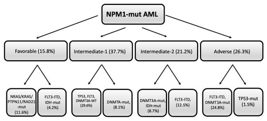 Mutational profile of NPM-1-mut AMLs subdivided into four different prognostic groups (favorable, intermediate-1, intermediatye-2, and adverse), each comprising two different subgroups, whose mutational profile is shown. Within parenthesis it is shown the frequency of each subgroup with respect to total NPM1-mut AMLs. The figure was freely adapted from data reported by Sanchez et al. [37].