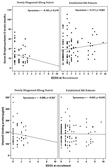 Correlation of vitamin D and Binding protein with EDSS. Serum level of 25(OH)D and VDBP are represented by black dots.