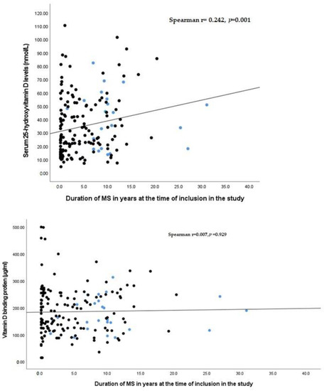 We could not establish any significant correlation of EDSS with levels of 25(OH)D and/or DBP (Figure 2). However, serum 25(OH)D significantly positively correlated with the duration of the disease (r = 0.242; p = 0.001) (Figure 3). This could be ascribed to the frequent medical attention provided to patients with long-term MS with the consequence of increased awareness of the disease and the use of vitamin supplements apart from the specific medications.