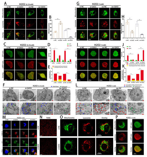 A mitochondrial green fluorescent probe (Beyotime, Shanghai, C1049) and lysosomal red fluorescent probe (Beyotime, Shanghai, C1046) were used to identify and track mitochondria and lysosomes. Following the manufacturer’s instructions, HUVECs were transfected with siRNA or plasmids for 48 h. HUVECs were labeled with probes and then treated with H2O2. Finally, the cells were observed and images were acquired using a confocal microscope (Nikon A1R, Tokyo, Japan).