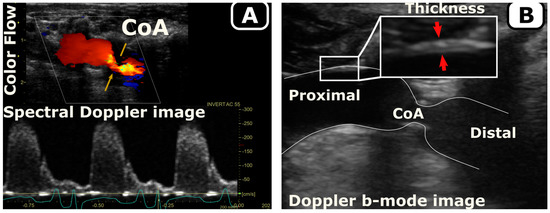 Using body weight at arrival and according to the growth rate for New Zealand White rabbits [38], age was estimated and then scaled to that of humans according to the duration of different phases of life [39] (Figure 1). Temporal hemodynamic and morphological evaluation was performed as a function of age using Doppler ultrasound imaging following protocols similar to human transthoracic echocardiography. Specifically, Doppler color flow and spectral Doppler images (Figure 2A) were used to identify pre- and post-stenotic flow and associated peak velocity for Doppler-based hemodynamic assessment, while b-mode imaging (Figure 2B) was used to quantify morphological properties, such as aorta diameter, wall thickness, and percentage area obstruction, using the protocols detailed elsewhere [8,9]. Moreover, phase-contrast magnetic resonance imaging (PC-MRI) was performed to characterize morphological properties, as well as quantify cardiac output and flow distribution to the main aortic branches [8,9]. Lastly, high-fidelity BP measurements were performed at the end of the protocol via invasive catheterization before harvesting of aortic tissue for further invasive characterization, e.g., material properties through uniaxial extension testing and vascular dysfunction through myograph analysis (Figure 1). Together, these empirical measurements were quantified as surrogates (i.e., precursors) of hypertension including arterial thickening, stiffening, and dysfunction, as detailed in the next subsections.
