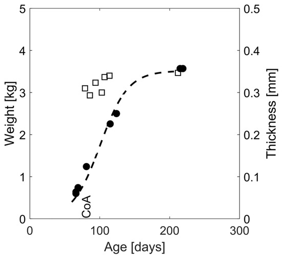 Representative thickness and body weight evolution over time for a CoA rabbit. Thickness (squares) was quantified as a function of age and through weekly ultrasound imaging at follow-up where 2D sagittal sections of the aorta were identified in b-mode images, and triplicate thickness measurements were performed with mean values shown at each timepoint. Body weight evolution was extrapolated using a sigmoid fit (dashed line) to the measured body weights (circles).