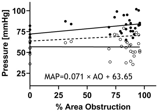 High-fidelity BP measurements proximal to CoA via catheterization. Rabbits (n = 55) were anesthetized for measurement of the BP above the coarctation prior to tissue harvest using high-fidelity pressure transducers (Harvard Apparatus, Holliston, MA, USA) attached to 0.86 mm ID noncompliant fluid-filled catheters inserted into the right common carotid artery and advanced to the aortic arch. Systolic blood pressure (SBP: black circles), mean arterial pressure (MAP), and diastolic blood pressure (DBP: open circles) were then quantified from the BP waveforms. Linear regression was then used to mathematically model MAP (dashed line) as a function of percent area obstruction (formula).