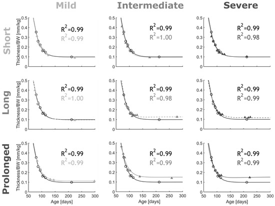 Thickness evolution for CoA rabbits (scatter) and G&R model predictions (lines). Coarctation-induced arterial thickening (shades of gray) was quantified from Doppler ultrasound b-mode images. To compare with control group, thicknesses were normalized to body weight (black). CoA groups included all combinations of severity (mild, intermediate, and severe) and duration (short, long, and prolonged) studied. G&R model constitutive parameters were tuned to fit empirical measurements (n = 2/group) with adjusted R2 characterizing goodness of fit.