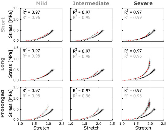 Empirical stress–stretch curves for CoA (gray) vs. control (black) groups and G&R model prediction (red). Error bars representing the SEM were quantified and averaged at each strain energy level discretized over the range of 0 to 3 MPa. The constitutive material parameters identified are listed in Table 2.