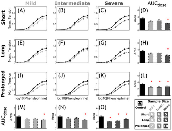 Comparative representation of active contraction response to PE in CoA vs. control. Dose response curves (myography) by increasing half-log dose of phenylephrine (PE: administered every 5 min). The measured contractile force was normalized to maximum K+ contraction achieved for each segment. The nine CoA groups consist of all combinations of severity (mild, intermediate, and severe: different gray levels) and duration (short, long, and prolonged: different line styles) studied, compared to the control group (black) in each plot (A–C,E–G,I–K). Bar plots (D,H,L–O) represent the area under each dose–response curve (AUC). Error bars represent the SEM. * Significant difference compared to the control group in a two-tailed Student’s t-test with a 5% significance level, assuming similar variation among the groups.