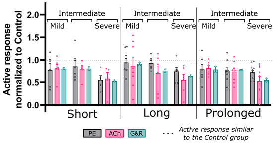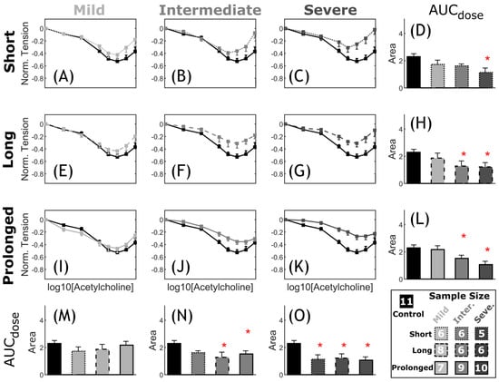 Comparative representation of CoA vs. control active relaxation response to ACh. Dose–response curves (myography) by increasing the half-log dose of acetylcholine (ACh: administered every 5 min). Relaxation was measured relative to the initial contraction (EC50 concentration). The nine CoA groups consisted of all combinations of severity (mild, intermediate, and severe: different gray levels) and duration (short, long, and prolonged: different line styles) studied and compared to the control group (black) in each plot (A–C,E–G,I–K). Bar plots (D,H,L–O) represent area under each dose–response curve (AUC). Error bars represent SEM. * Significant difference compared to the control group in a two-tailed Student’s t-test with 5% significance level assuming similar variation among the groups.