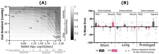 G&R model prediction (A) and prediction error (B) relative to the measured impaired vascular response. (A) Contour plot showing impairment index quantified by taking the ratio of active stress per unit relaxed SM for CoA relative to control using the G&R framework. Contour lines indicate regions of constant impairment indices. CoA severity, shown on the vertical axis, is characterized through peak-to-peak trans-coarctation BP gradient (BPG), whereas duration is represented on a logarithmic scale of age in days. (B) Model error relative to measured impairment index, i.e., area under the active dose–response curves (AUC) for each CoA group normalized to that of the control. Dose–response curves were quantified via wire myography and half-log increase of phenylephrine (PE, gray) and acetylcholine (Ach, pink) to characterize NO active response in SM contraction and relaxation, respectively. Model error was then quantified as a percentage relative to the empirical PE and Ach impairment indices. Rabbits used in the tuning process were excluded for model prediction error.