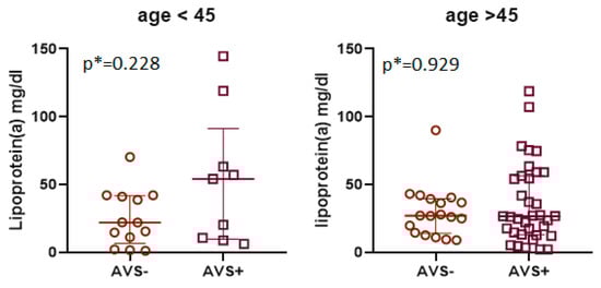 Similar to the pathomechanism of atherosclerosis, many studies have pointed to the importance of pro-inflammatory processes in the pathomechanism of AVS development. CRP and IL-6, as markers of inflammation, have been widely studied and described as factors in the development of atherosclerosis. Some works found a positive association between levels of plasma IL-6 and the progression of AVS. Furthermore, not only the concentration of IL-6 but also the genetic variants of this parameter and its receptor seem to be important in the clinical status of AVS [,]. The LPA gene contains an IL-6 response element [], and some data support a positive association between IL-6 and Lp(a). It has been claimed that Lp(a) levels are elevated in patients with increased serum IL-6, which is most closely related to an increased risk of atherosclerosis []. The link between CRP and AVS development is not clear. Some researchers have suggested no association [,], but others have suggested an association between CRP levels and the incidence of AVS even in a population with low CRP levels []. In the study by Topçiu-Shufta et al., evaluating a correlation of inflammation with Lp(a) in hemodialysis patients, significant positive correlations were observed in individuals with high CRP levels (>10 mg/L), not only between Lp(a) and CRP but also between Lp(a) and IL-6 concentration []. In our study, we showed no significant correlation between either IL-6 and Lp(a) or between CRP and Lp(a) in any of the analyzed groups of BAV patients; however, our study did not include patients with acute inflammation (CRP > 10 mg/L) according to the exclusion criteria. Nevertheless, we demonstrated a significantly higher concentration of IL-6 in patients below 45 years of age with AVS, which may suggest an incipient inflammatory process, one of the common pathomechanisms of valvular anomaly []. However, this observation was not confirmed in the group of older patients, which may have resulted from a statistically significant difference in statin therapy (Table 1), as well as from the fact that with increasing age, additional other risk factors have an impact on inflammation.