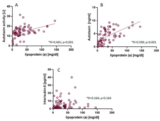 Univariate correlation between lipoprotein(a) concentration and autotaxin activity (A), autotaxin concentration (B), and interleukin-6 concentration (C). Values are presented as single points and expressed as standardized Spearman coefficients (*).