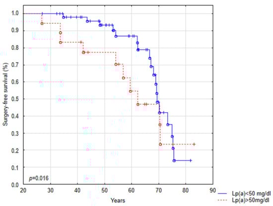 In the studied BAV patients, the need for surgical replacement of the valve occurred in 28 patients; however, among the analyzed variables (concentration of IL-6, ATX, Lp(a), lipid profile parameters, diabetes, smoking, Lp(a) > 30 mg/dL, and Lp(a) > 50 mg/dL), only a high concentration of Lp(a) with a cut off 50 mg/dL was predictive of a shorter surgical-free survival (p = 0.016) (Figure 3).