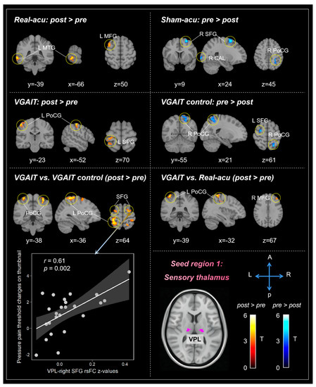 We found that VGAIT exhibited enhanced rsFC between the thalamus (VPL/MD/Mthal) and PFC/ACC/somatosensory cortex compared to the VGAIT control; the changes in VPL-SFG rsFC were positively correlated with pressure pain relief. Moreover, VGAIT exhibited a significantly increased rsFC of the Mthal-AIS after treatment.