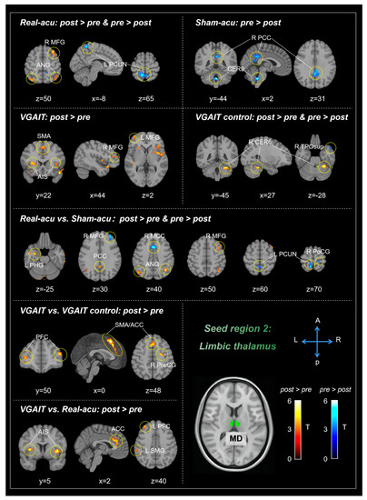 In addition, we found acupuncture and VGAIT increased rsFC between the MD and the right DLPFC, compared to pre-intervention. A recent study found that thalamus-DLPFC pathways might play a crucial role in regulating chronic pain and associated depression [87]. Thus, modulating rsFC between MD with the DLPFC may also represent a common mechanism underlying acupuncture and VGAIT in pain management.