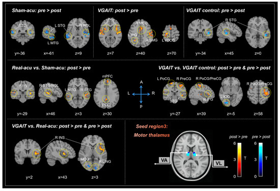 We also found that real acupuncture demonstrated increased rsFC between the Mthal and the bilateral STG, PCC, left MTG, right ROL, and medial prefrontal cortex (mPFC) compared to sham acupuncture. VGAIT demonstrated increased rsFC between the Mthal and the bilateral PoCG, PreCG, STG, MTG, right inferior temporal gyrus (ITG), and IFG, as well as reduced rsFC between the Mthal and left inferior occipital gyrus (IOG), compared to the VGAIT control group. Furthermore, VGAIT showed enhanced rsFC between the Mthal and the right insula, as well as reduced rsFC between the Mthal and the right LING and left MOG, when compared to real acupuncture (Table 3, Figure 3).