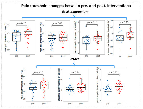 Pain threshold changes between pre- and post-interventions. Notes: Pairwise t-tests were performed. The boxplot shows the mean ± SD of pain thresholds. Abbreviations: VGAIT, video-guided acupuncture imagery treatment.