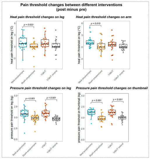 Paired samples t-test (Student’s t-test) on pre- and post-pain threshold differences across four interventions showed that real acupuncture significantly increased the pain threshold for all four measurements (p < 0.05). VGAIT significantly increased the heat pain threshold on the leg (p = 0.017), and the pressure pain threshold on the leg (p < 0.001) and the thumbnail (p < 0.001). There were no significant results in sham acupuncture and VGAIT control conditions (see Figure 4 and previous publication [10] for the details of pain threshold changes after different interventions).