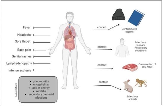 - Reynolds, M.G.; Yorita, K.L.; Kuehnert, M.J.; Davidson, W.B.; Huhn, G.D.; Holman, R.C.; Damon, I.K. Clinical Manifestations of Human Monkeypox Influenced by Route of Infection. J. Infect. Dis. 2006, 194, 773–780. [Google Scholar] [CrossRef] [PubMed]