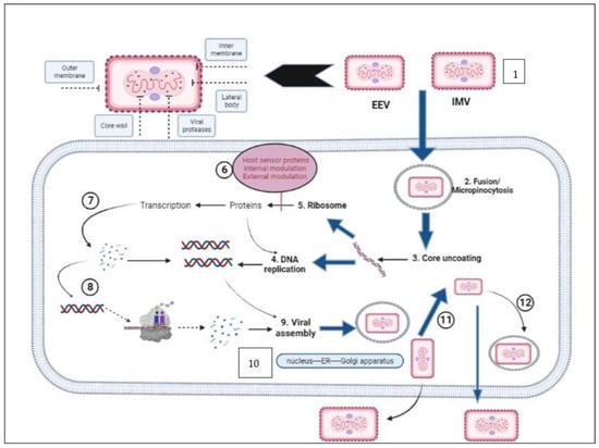 Steps of MPXV entry into host cells. (1) Schematic of the structure of MPXV. (2) Both the EEV and IMV virions penetrate the host membrane by binding and macropinocytosis. MPXV virions use glycosaminoglycans as host receptors. (3) After the internal virion components enter the cytoplasm, core uncoating occurs, and this process leads to delivery of the MPXV genome and accessory proteins to the cytosol. (4) The released MPXV genome is used as a template for DNA replication. (5) Early viral DNA transcription followed by translation into the host ribosome occurs to encode essential proteins. Early proteins aid in DNA replication. (6) These proteins interact with host sensor proteins, resulting in internal and external modulations. The major intracellular modulations include prevention of viral genome detection, induction of cell cycle arrest, apoptosis inhibition, inhibition of the antiviral system, and modulation of some host cellular signaling pathways. Early proteins play essential extracellular roles as immunomodulatory agents and as growth-factor-like domains that stimulate onset of mitosis in neighboring cells. (7) Early proteins are used in production of intermediate proteins. (8) These proteins are involved in late transcription and translation processes and aid in DNA replication. (9) Late proteins are essential components for viral assembly. (10) Viral morphogenesis occurs by formation of inner tubular nucleocapsid structure folding and assembly of viral glycoproteins to generate IMV virions. (11) Except those released via infected cell lysis, IMV virions transit to the Golgi apparatus along microtubules for double membrane wrapping. (12) The resulting EEV virions exit the infected cell by two routes: by the actin tail assembly, which provides enough force to propel the virions out of the cell, or by budding from a cellular membrane. EEV: extracellular enveloped virus. IMV: intracellular mature virus.