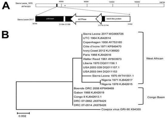 Phylogenetic analysis and molecular signature of MPXV [134]. Phylogenetic study and comparative molecular signature of the previously collected MPXV isolates and MPXV isolated in Sierra Leone in 2017 [134]. (A) A graphical representation of the genomic fragment of MPXV in Sierra Leone, 2017, with reference to the data on genome of MPXV Sierra Leone 1970. There are three sections that make up the MPXV Sierra Leone 2017 virus: an unknown area, genes that encode dUTPase, and genes that encode a partial kelch-like protein. The binding site of primers that are utilized for real-time PCR detection. Bottom panel displays genes reported. The direction of transcription is shown by the arrows. (B) Phylogenetic relationship between genomic segments of other OPXVs and MPXV collected in Sierra Leone. Neighbor-joining phylograms built with the maximum-likelihood approach with the software “MEGA version 6.0” (https://www.megasoftware.net). The scale bar represents the number of nucleotide changes at each location.