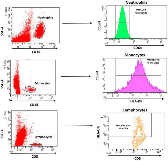Gating strategy analysis using flow cytometry of CD64 expression on neutrophils and HLA-DR expression on monocytes and lymphocytes.