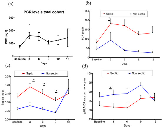 As shown in Figure 2, the dynamics of CRP (Figure 2b), sepsis index (Figure 2c), and MHLA-DR expression (Figure 2d) over time differed between groups. Septic patients showed increased levels of CRP (septic patients: 182.9 ± 132.9 mg/mL; non-septic patients: 93.46 ± 117.6 mg/mL; p = 0.030) (Figure 2b) and sepsis index (septic patients: 0.19 ± 0.19; non-septic patients: 0.08 ± 0.08; p = 0.010) (Figure 2c) on day +3 after admission. In contrast, the MHLA-DR rate was found to be decreased (septic patients: 81.7 ± 16.22%; non-septic patients: 88.53 ± 12.13%; p = 0.040) (Figure 2d). The MHLA-DR rate slowly recovered before 6 days, while the sepsis index remained higher in septic patients up to day +9. There were no differences in the lymphocyte count, the MFI of MHLA-DR, or the HLA-DR index between groups during the follow-up (Supplementary Tables S1 and S2).