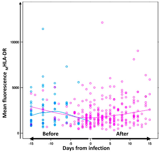 Differences in the mean fluorescence of MHLA-DR on monocytes from septic and non-septic patients before infection. Dynamic values of mean fluorescence intensity of MHLA-DR on monocytes from septic (pink) and non-septic (blue) patients during 15 days of follow-up over time. In the septic group, day 0 was considered when sepsis was diagnosed. The continuous lines represent the mean HLA-DR fluorescence intensity values in monocytes for septic patients (pink) and for non-septic patients (blue) before and after infection.