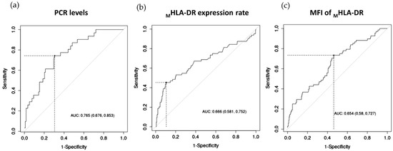 (a) ROC curves of CRP levels; (b) the expression rate of HLA-DR on monocytes; and (c) MFI of MHLA-DR for the diagnosis of patients with higher risk to develop sepsis during their stay in ICU.