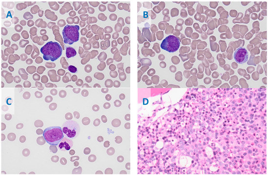 Bone marrow aspirate smears show increased leukemic blasts (20.5%). The blasts are medium to large sized with high N:C ratio, with round to irregular to slightly convoluted nuclear contours, and have a finely dispersed chromatin pattern and visible nucleoli with variably basophilic and rarely azurophilic granules; overall, the blasts have features of monoblasts (A) and promonocytes (blast equivalents (B). Occasional neutrophils are dysplastic with abnormal nuclear lobation and hypogranulation (C). The core biopsy shows leukemic blast infiltration (D); (A–C), Wright–Giemsa Stain, at 1000×; (D), Hematoxylin and Eosin stain, with a magnification of 400×.