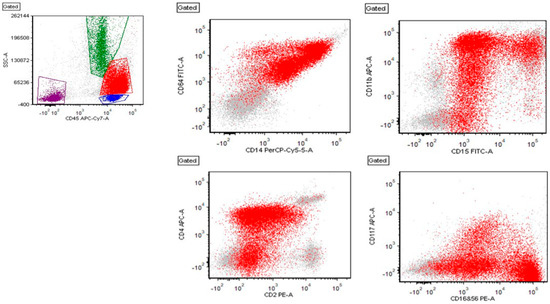 Flow cytometry showing red: leukemic blasts, green: granulocytes, blue: lymphocytes, and burgundy: debris. The blasts are positive for CD45, CD64, CD14, CD15, CD11b (partial), CD2 (partial), CD4, CD16+56 (partial, bright), and CD117 (partial) (shown here). The blasts are also positive for (not shown here) CD13, CD33, HLA-DR, CD52 (partial), CD99, CD58, CD38, and myeloperoxidase (partial).