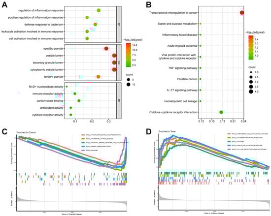Using the R package “clusterProfiler”, DEGs enriched in the GO and KEGG pathways were examined. The results were primarily concentrated on immune and inflammatory responses. A threshold of adj. p value < 0.05 corrected by FDR was set, and the top five biological processes (BPs), cellular components (CCs), and molecular functions (MFs) were displayed, with the defense response to a bacterium, the secretory granule lumen, and immune receptor activity being the most enriched functions in sepsis patients (Figure 3A). The KEGG analysis uncovered a lot of immune-related enriched pathways, including the TNF signaling pathway, IL-17 signaling pathway, and cytokine–cytokine receptor interaction. The adj. p value < 0.2 was corrected using FDR (Figure 3B). Furthermore, a GSEA analysis revealed tight correlations of all genes with the toll-like receptor signaling pathway and complement and coagulation cascades in septic infants (Figure 3D).