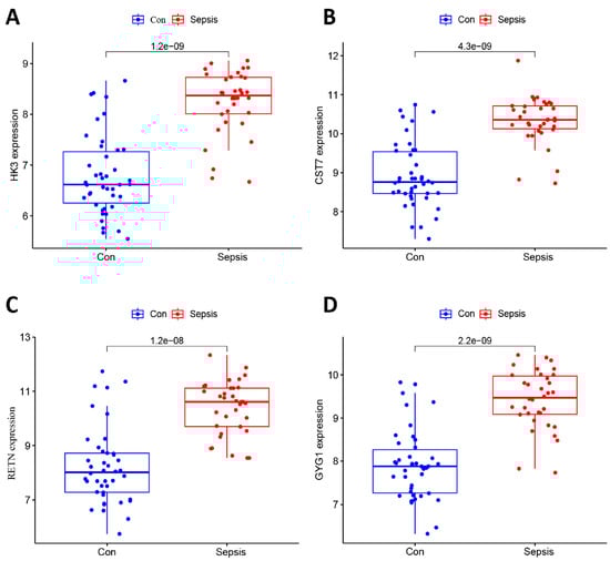 Validation of the OFGs in testing dataset. (A–D) Expression of HK3, CST7, RETN, and GYG1 in testing dataset of septic and control (Con) neonates.