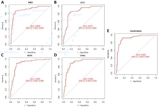 Diagnostic effectiveness of OFGs in the dataset of septic shock. (A–E) ROC curves for diagnostic effectiveness of HK3, CST7, RETN, GYG1, and combined in neonatal septic shock.