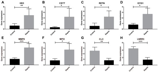 We identified eight key genes among sepsis-related DEGs using the LASSO algorithm (Figure 4A), and SVM-REF was used to select ten useful genes (Figure 4B). Additionally, the RF algorithm filtered out nine valuable genes (Figure 4C). The four upregulated OFGs, called Hexokinase 3 (HK3), Cystatin 7 (CST7), Resistin (RETN), and Glycogenin 1 (GYG1), were obtained by intersecting the genes with three advanced machine learning techniques. After further validation by the testing group, the expression of these four OFGs was significantly increased in neonates with sepsis (Figure 5). After that, we constructed ROC curves of the OFGs in the validation dataset to check their diagnostic efficiency. The results showed that in the testing group, all OFGs showed exciting diagnostic values with AUCs above 0.88 (Figure S1). In addition, an external dataset on 3-month-old infants with septic shock was selected for validation. The results showed that the AUC values for the genes were above 0.92, except for CST7 (Figure 6). Next, we measured the expression levels of the OFGs, two down-regulated genes (CLC and LRRN3) and classic sepsis genes (MMP8 and MPO) in LPS-treated HUVECs in vitro using qRT-PCR. The results of RT-PCR were consistent with the trend of bioinformatic analysis (p < 0.05; Figure 7).