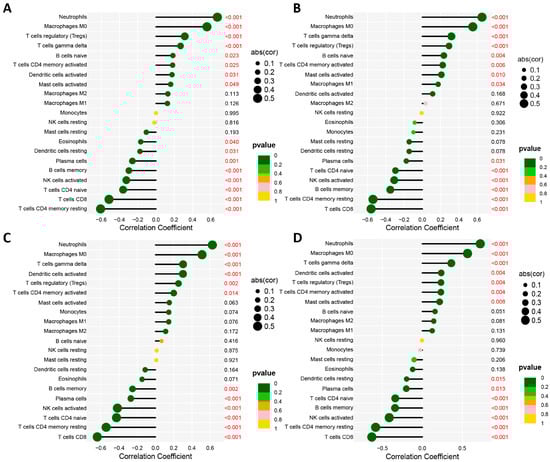 Visualization of Spearman correlation between 4 optimal feature genes and immune infiltrating cells in neonatal sepsis (NS). (A) HK3. (B) CST7. (C) RETN. (D) GYG1.