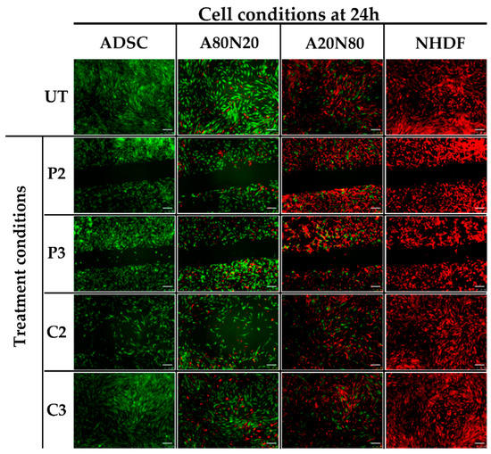 The 2D migration assay. Image acquisition at 24 h following Ibidi insert removal and treatment with gap closed for all cell conditions after treatment with C3, and gap persistence after treatment with both P2 and P3 PVP-I concentrations (UT—untreated; green—ADSCs; red—NHDFs; scale bar—250 µm).