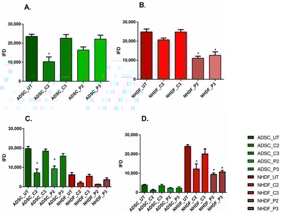 Integrated fluorescent density (IFD) for the 2D migration assay. (A) ADSC monocultures, with IFD lower for C2 (* p ˂ 0.0001); (B) NHDF monocultures with statistical differences for PVP-I concentrations compared with untreated cultures (* p ˂ 0.0001); (C) A80N20 cocultures, with IFD for stem cell fraction significantly lower for P2 and C2 (* p ˂ 0.0001); (D) A20N80 coculture, with significant differences IFD for fibroblast fraction (* p ˂ 0.0001); all data are displayed as means with standard errors (SEM; UT—untreated).