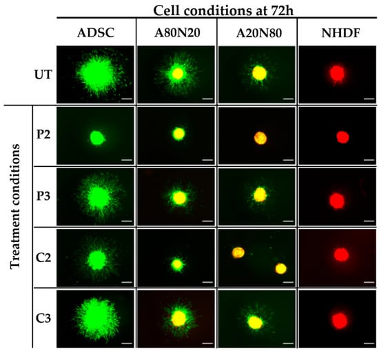 3D sprouting assay. Image acquisition at 72 h following treatment shows reduced sprouting after treatment with P2 and C2 (P2 ˂ C2) and less robust proliferation zone as stem cell ratio decreases (cell conditions with ADSC 100% vs. 80% vs. 20%); (UT—untreated; green—ADSCs; red—NHDFs; yellow shades due to overlay; scale bar—250 µm).