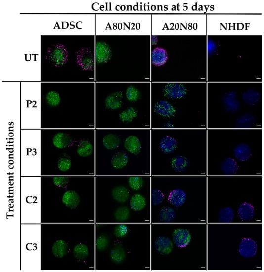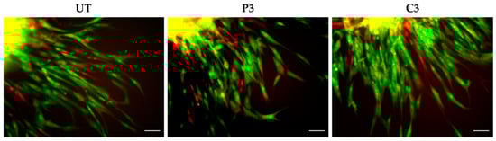 Confocal images representative of A80N20 coculture behavior. After treatment with P3, the spikes contained more fibroblasts compared with the spikes treated with C3, which contained more stem cells (UT—untreated; green—ADSCs; red—NHDFs; yellow shades due to overlay; scale bar—100 µm).