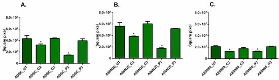 Sprouting area for stem cells in 3D systems with sprouting area reduction after treatment with P2 and C2 (* p ˂ 0.0001). (A) ADSC monocultures; (B) A80N20 coculture; (C) A20N80 cocultures; all data are displayed as means with standard errors (SEM; UT—untreated).