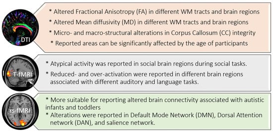 As summarized in Figure 1, both DTI and fMRI have revealed significant differences in ASD brains. In DTI, altered FA and MD have been reported in different brain regions. In addition, alterations in CC integrity have been reported at both micro- and macro-structural levels. Using fMRI, different reports have used T-fMRI to reveal atypical activities during social tasks and different auditory and language tasks. On the other side, rs-fMRI, being more suitable for infants and toddlers as not involving specific tasks, has been used to report altered brain connectivity in DMN, DAN, and salience networks.