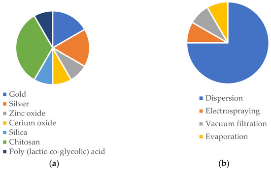Figure 1 illustrates the trends of the last 6 years in the fabrication of fibers functionalized with NPs, including the most commonly used materials, loading strategies, and production methods in microbial balance approaches. CS-based NPs are the major contributors to these numbers followed by inorganic NPs, like silver and gold. Regarding the NP-loading, the dispersion method, in which the NP solution is dissolved in the polymeric solution until a homogenous solution is achieved, is the most explored method. Moreover, synthetic polymers are the most employed to produce fibers in this case, as well as electrospinning as the production method of fibers.