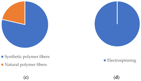 Representative frequency analysis of (a) NP composition; (b) NP loading on fibers; (c) fibers class materials; (d) fiber production method for tissue regeneration applications according to published literature since 2017 (databases: Scopus and PubMed).
